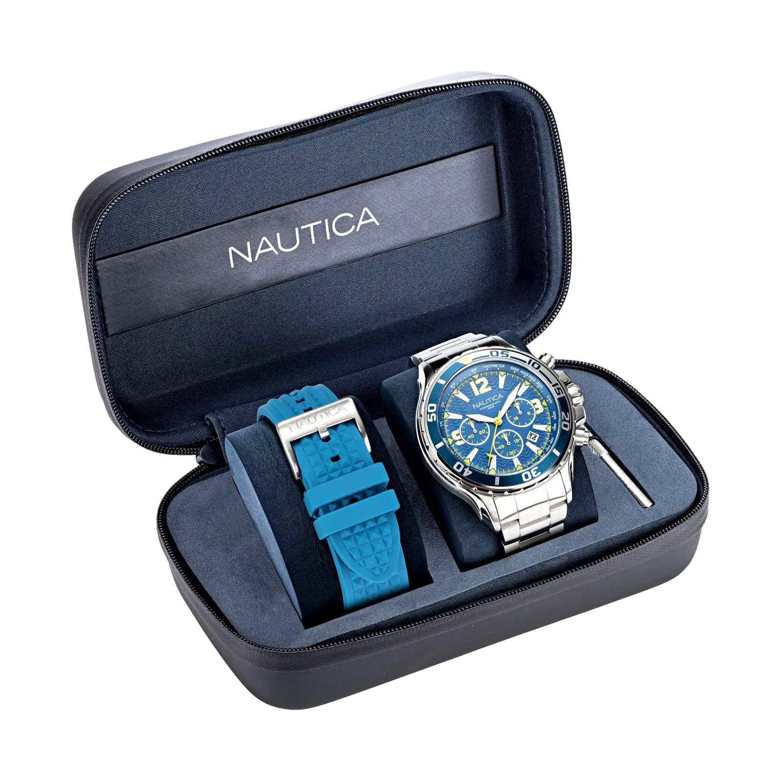Nautica NAPNSS219 to żeglarski chronograf w formie eleganckiego zestawu „box set” – gotowy na dzień na wodzie i wieczór w porcie. Duża, stalowa koperta oraz bransoleta typu link dają wyrazisty, premium charakter, a dołączony pasek silikonowy pozwala szybko przejść w tryb sportowy.